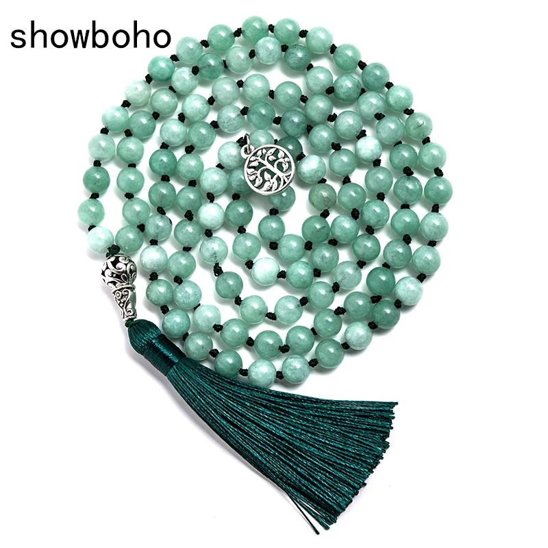 8mm Burmese Jade Knotted Beaded Mala Necklace Meditation Yoga Blessing Lucky Tibetan Jewelry 108 Japamala Rosary Tassel Pendent