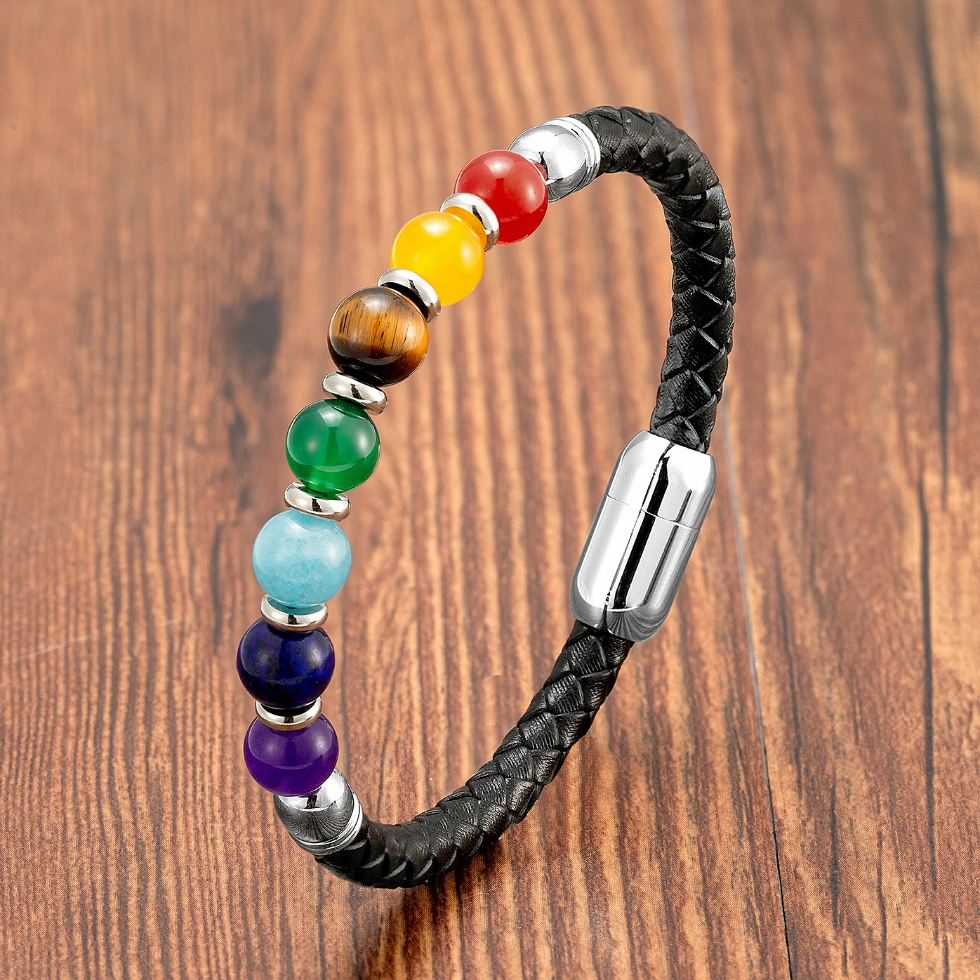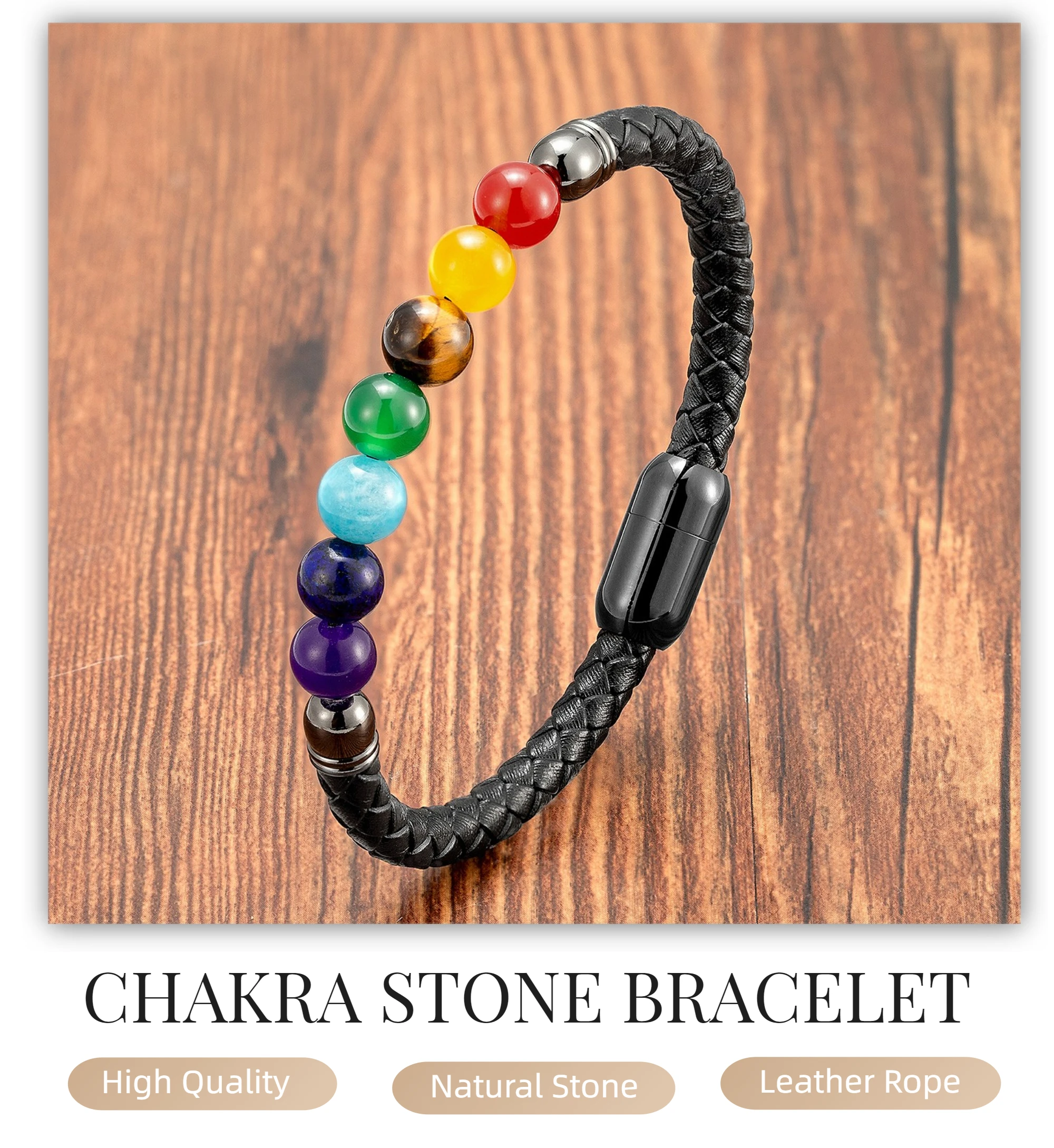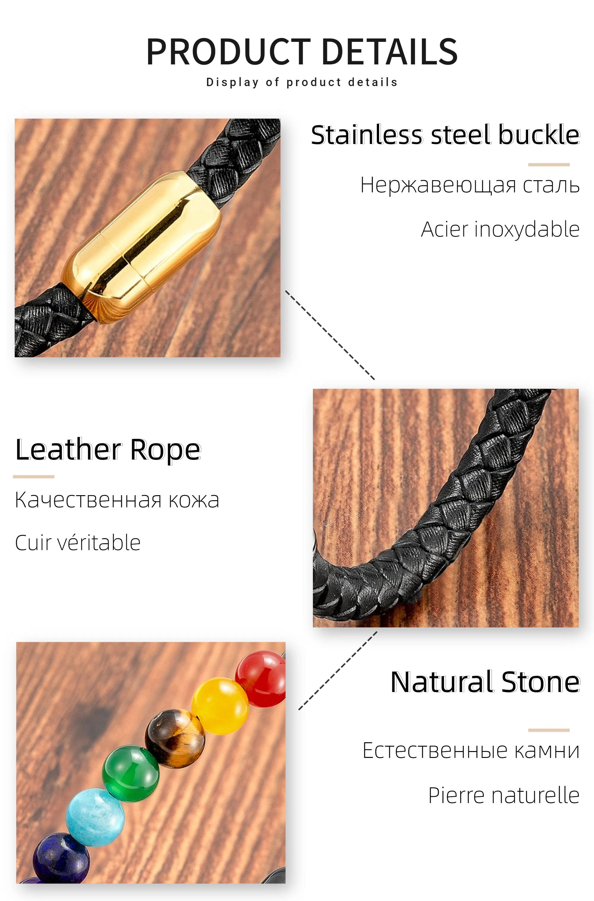 Enhance your style with the YISHUCHA Chakra Bracelet for Women. This classic piece features a round design with a combination of natural stones and a black leather rope chain. The neutral color scheme makes it suitable for both men and women, making it a perfect couple bracelet.