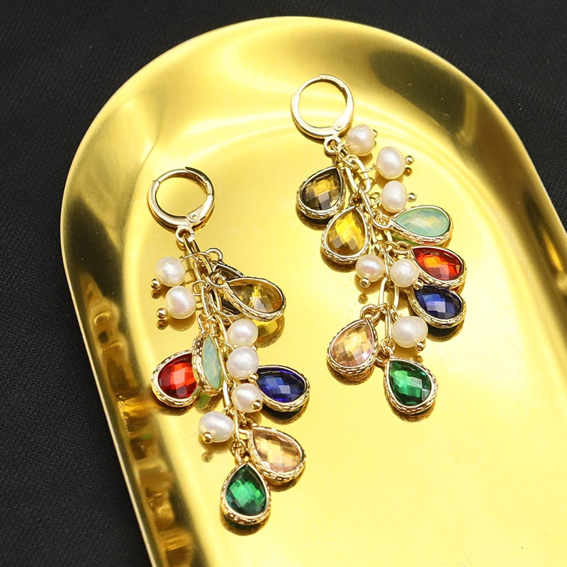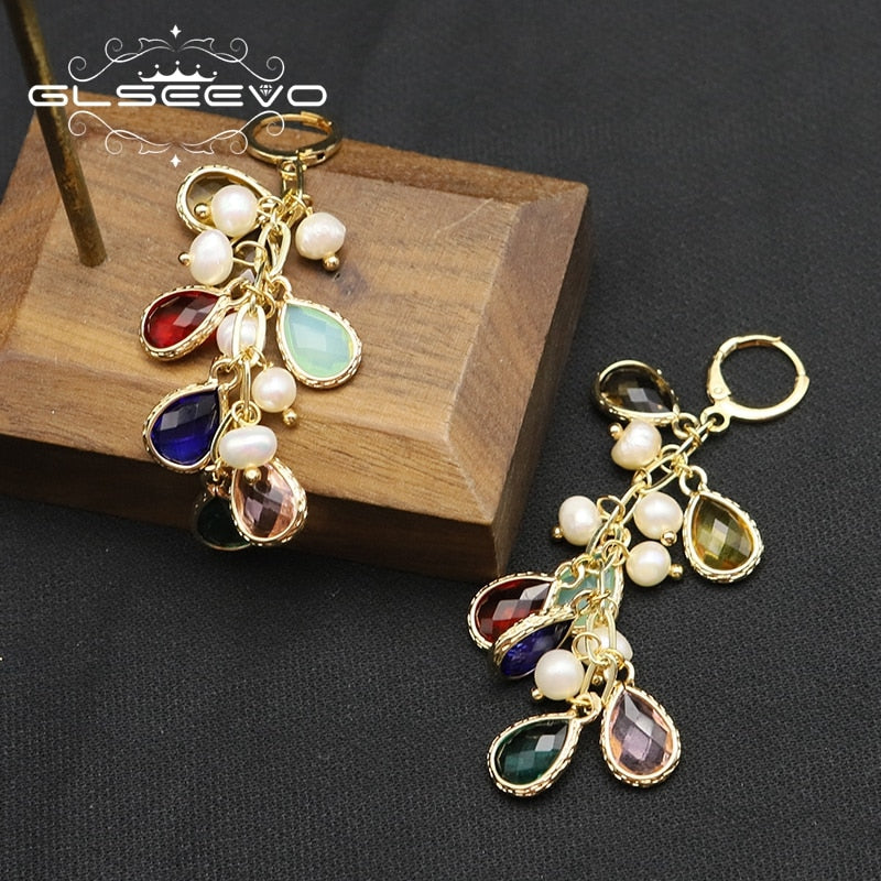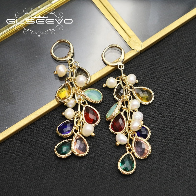 GLSEEVO Colorful Water Drop Pearl Woman Earrings Korea Metal Chain Exquisite Personality Temperament Jewelry Party BanquetGE1192