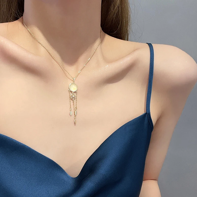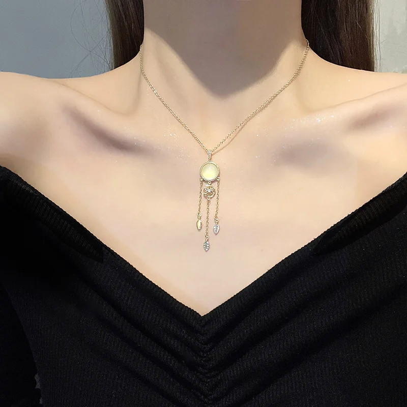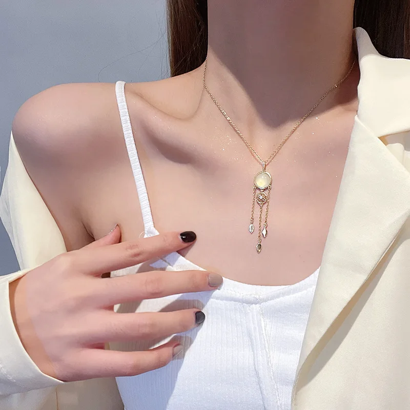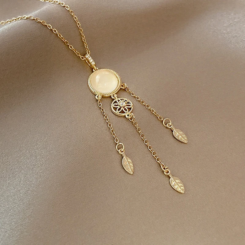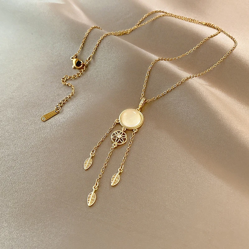 Crafted with high-quality stainless steel, this necklace is built to last and withstand everyday wear. The vintage-inspired design adds a touch of old-world charm, while the jade leaf pendant adds a unique and eye-catching element. The tassel detail adds movement and a playful touch to the overall design.