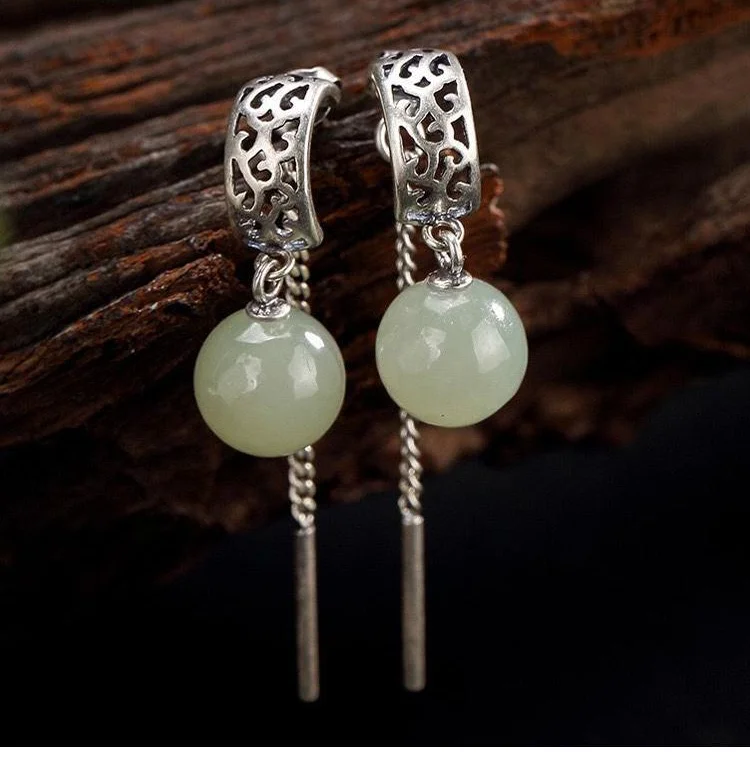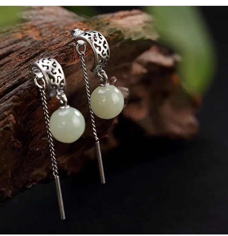 Introducing our exquisite ladies green long section Chinese style natural Hetian white jade inlaid round bead earrings. Crafted with precision and attention to detail, these earrings are a true testament to exquisite fashion jewelry.