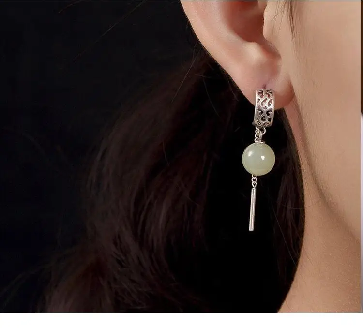 Ladies green long section Chinese style natural Hetian white jade inlaid round bead earrings exquisite fashion jewelry