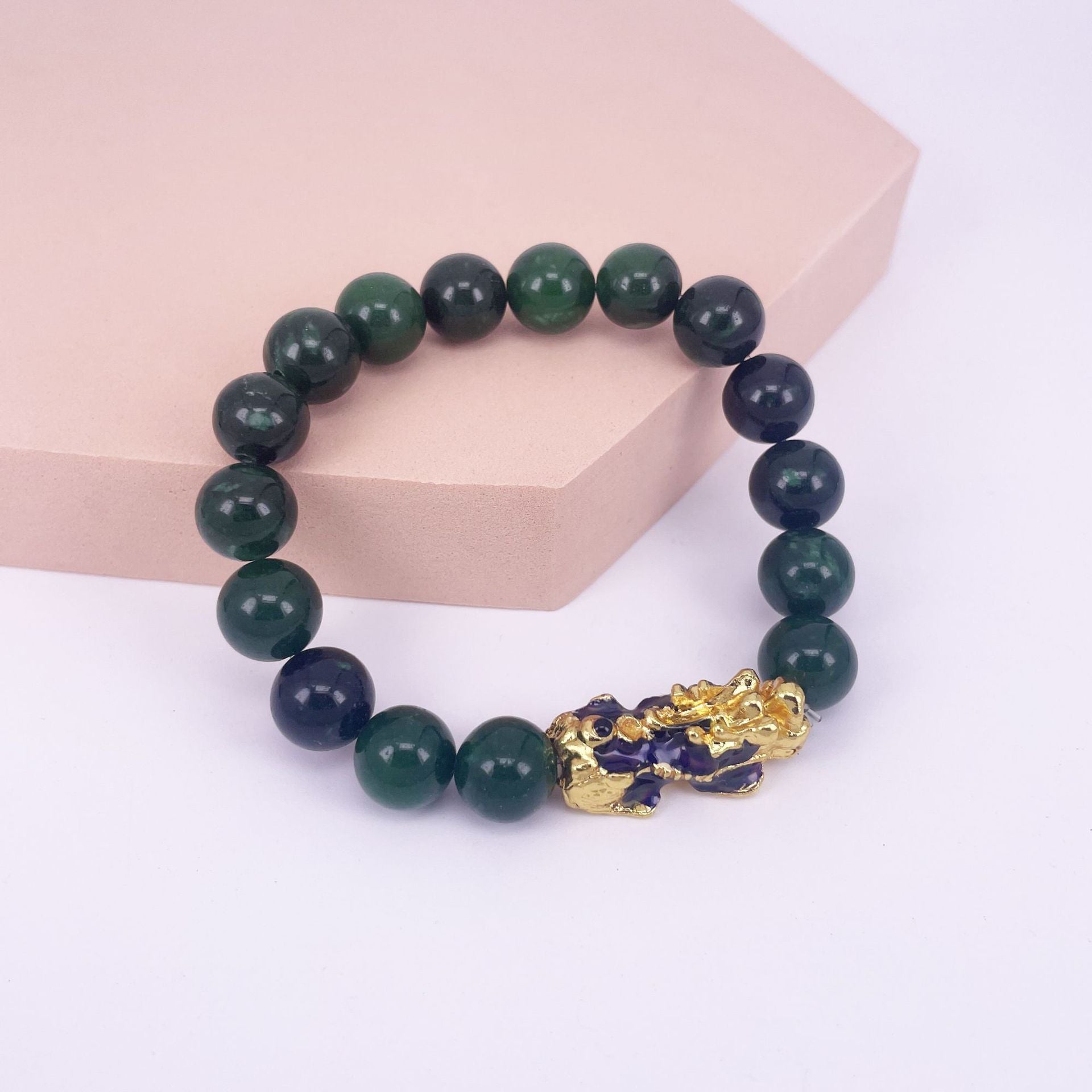 Introducing our Natural Jade Discolored Pixiu Bracelet for Men, a unique and stylish accessory that not only adds a touch of elegance to your outfit but also brings positive energy and good luck into your life. Made from high-quality stone and meticulously crafted with electroplating treatment, this bracelet is not only durable but also visually stunning.