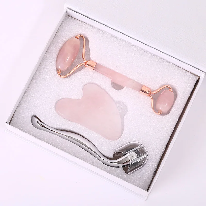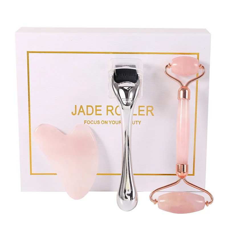 Natural Stone Jade Roller Facial Massager Microneedle Roller Jade Spatula Skin Care Three-piece Rose Quartz Roller Massager Tool
