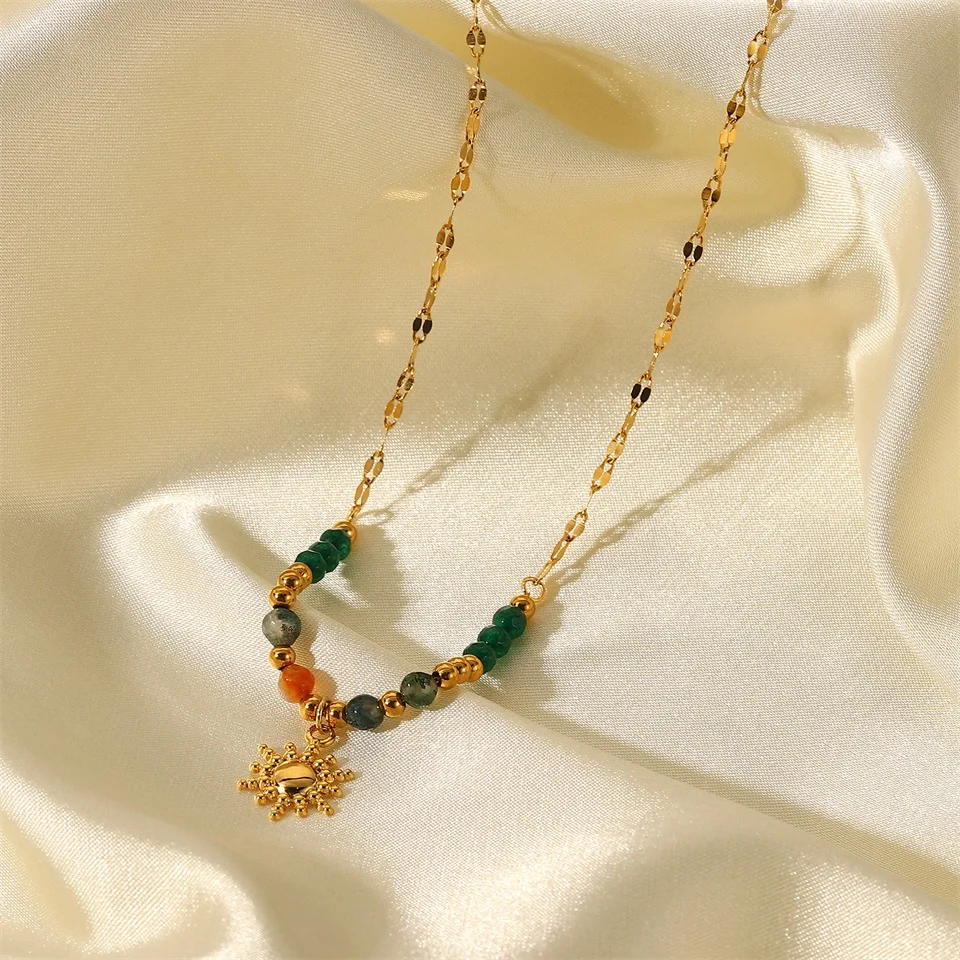 Introducing the latest trend in fashion jewelry - the Natural Stone Necklace Fashion Gold Color Stainless Steel Ball Pendant Necklace. This stunning piece is perfect for any occasion, whether it's a casual day out or a special party or anniversary celebration. Crafted with meticulous attention to detail, this necklace features a round pendant with a stainless steel ball, adding a touch of elegance to your ensemble.