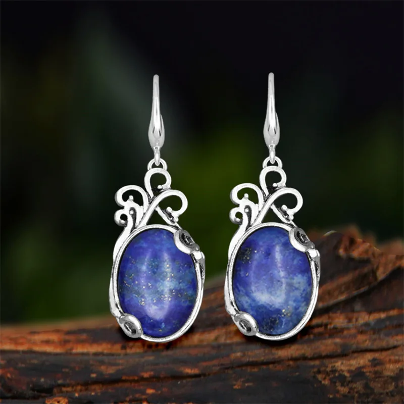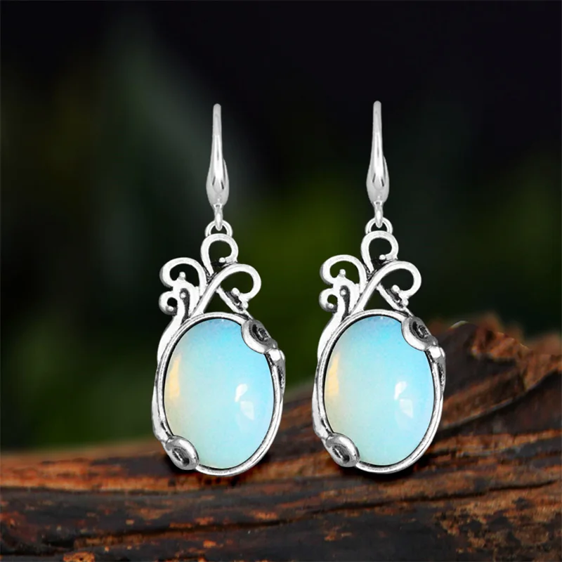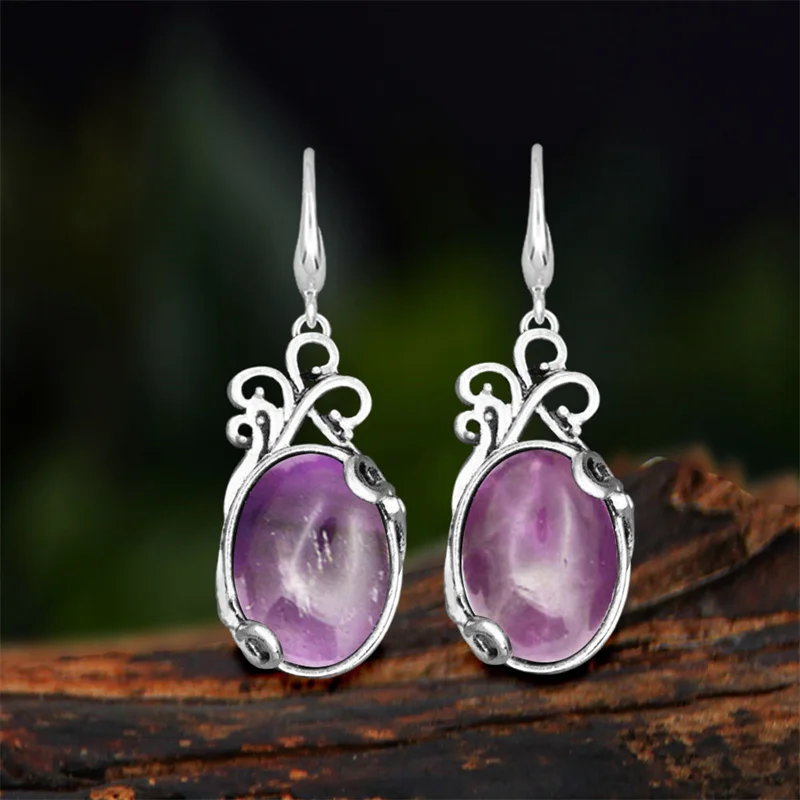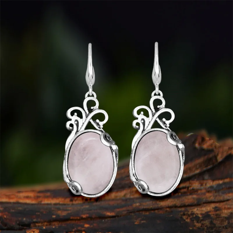 Vintage Natural Jades Dangle Earrings For Women Antique Silver Plated Pink Quartz Natural Stone Fashion Earring Jewelry
