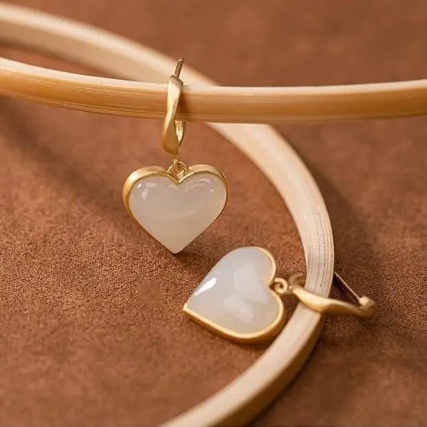 New silver inlaid natural Hetian White Jade Heart Shaped Earrings Chinese charm romantic craft gold women's brand jewelry